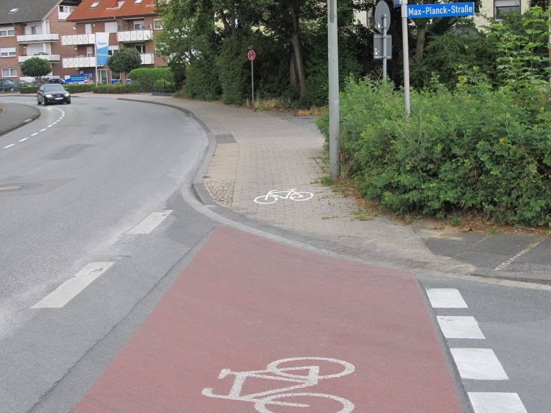 An den untergeordneten Straßen Franz-Grochtmann-Straße, Einsteinweg und Max-Planck-Straße sind die Zeichen 205 (Vorfahrt gewähren) und 206 (Halt. Vorfahrt gewähren) noch mit Zusatzzeichen 1000-32 (Radfahrer kreuzen von rechts und links) versehen. Die Zusatzzeichen müssen entfernt werden.