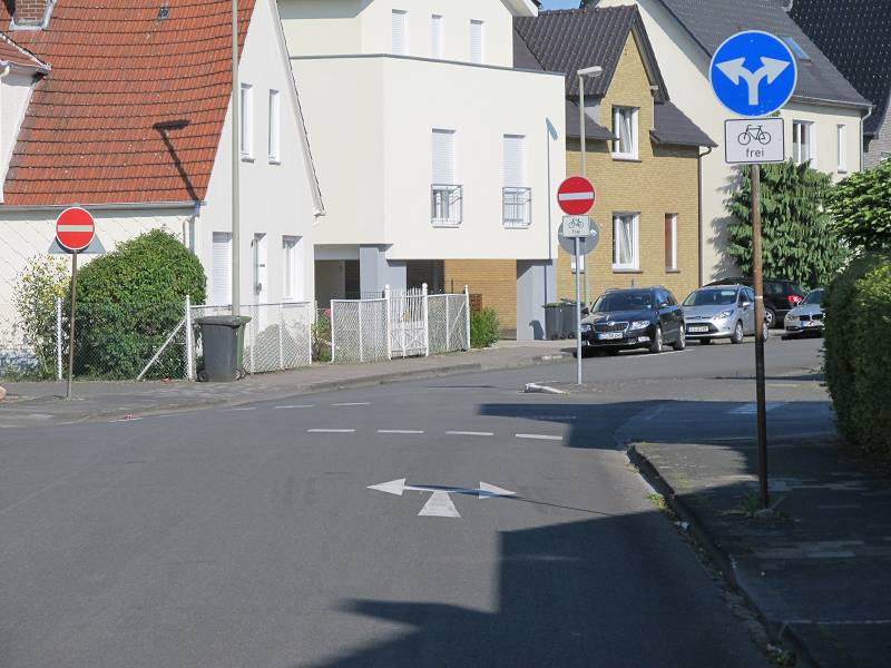 Im August 2013 wurde die Fahrbahn der Einbahnstraße in der Gegenrichtung für den Radverkehr freigegeben (Bild 3). Zudem wurden an den Verkehrszeichen "Einbahnstraße" und "Vorgeschriebene Fahrtrichtung" entsprechende Zusatzzeichen angebracht.