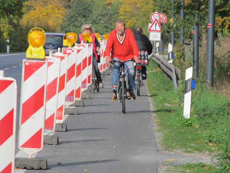 In Fahrtrichtung stadtauswärts müssen Radfahrer den rechten Seitenstreifen benutzen (Bilder 1 + 2). In Fahrtrichtung stadteinwärts ist der Geh-/ Radweg 500 m vor der Baustelle an der Kreuzung mit dem Blankenhagener Weg entgegen der eigentlichen Fahrtrichtung mittels Verkehrszeichen 240 StVO als benutzungsprlichtig gekennzeichnet (Bild 3). Ab der Baustellenabsperrung fahren die meisten Radfahrer regelwidrig auf dem linken Seitenstreifen weiter (Bilder 4 - 6). Die nutzbare Breite von maximal 1,30 m ist dafür unzureichend (Bilder 7 + 8).