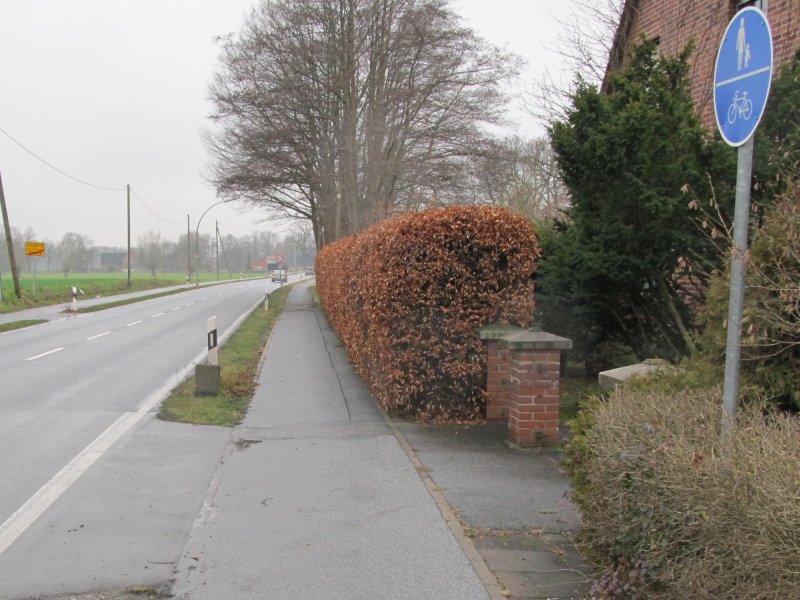 In dem innerorts verlaufenden Abschnitt zwischen der Kreuzung mit der Verler Straße und der Einmündung Kettelerstraße ist der Fuß- und Radweg nur 1,60 - 1,70 m breit. Zudem wird die Breite durch Pflanzenbewuchs noch weiter eingeschränkt (Bilder 2 + 3). Laut der Allgemeinen Verwaltungsvorschrift zur Straßenverkehrs-Ordnung (VwV-StVO) sollen gemeinsame Fuß- und Radwege innerorts mindestens 2,50 m breit sein.