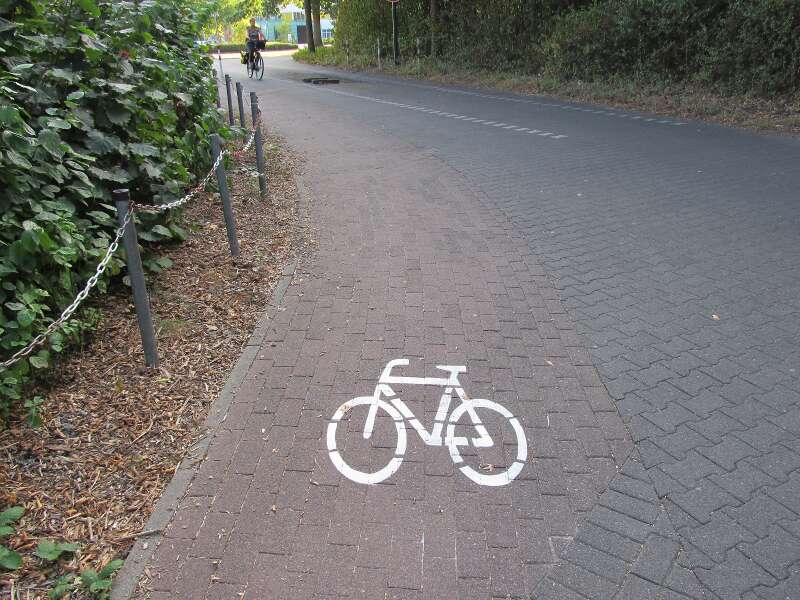 Die Markierung stellt klar, dass es sich bei dem Sonderweg in Fahrtrichtung links um einen reinen Radweg handelt. Da der linke Radweg nicht mit einem entsprechenden Verkehrszeichen gekennzeichnet ist, darf er laut § 2 Absatz 4 Satz 3 StVO nicht linksseitig befahren werden. Fußgänger müssen in dieser Richtung gemäß § 25 Absatz 1 StVO am rechten oder linken Fahrbahnrand gehen. In Fahrtrichtung rechts handelt es sich um einen Gemeinsamen Geh- und Radweg, der mittels Verkehrszeichen 240 StVO für den Radverkehr als benutzungspflichtig gekennzeichnet ist.