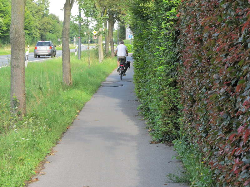 Bild 2 vom August 2012: Die Hecke wurde zwischenzeitlich geschnitten. Leider wird der Geh-/ Radweg weiterhin um ca. 50 cm eingeengt.