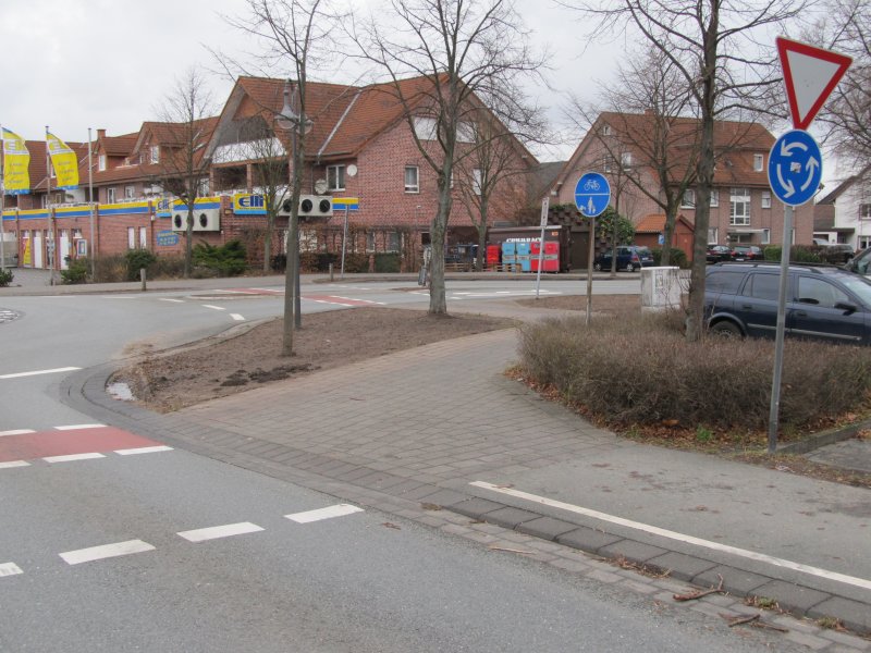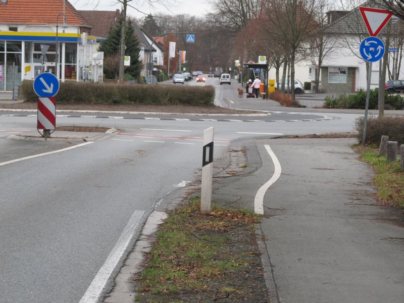 Radfahrer sollen mittels eines Grünstreifens und einer durchgezogenen Linie offensichtlich daran gehindert werden, sich vor dem Kreisverkehr in den fließenden Verkehr auf der Fahrbahn einzuordnen (Bild 1). Für den Radfahrer stellt sich hier die Frage, ob er am Ende der Linie in den Kreisverkehr enfahren darf, oder ob er den mit Zeichen 240 StVO beschilderten Fuß- und Radweg benutzen muss (Bild 2). Ob das Zeichen 240 für den Kreisverkehr umlaufenden Sonderweg oder für den nicht straßenbegleitenden Verbindungsweg zur Dompfaffenstraße gilt, ist unklar (Bilder 3 + 4).