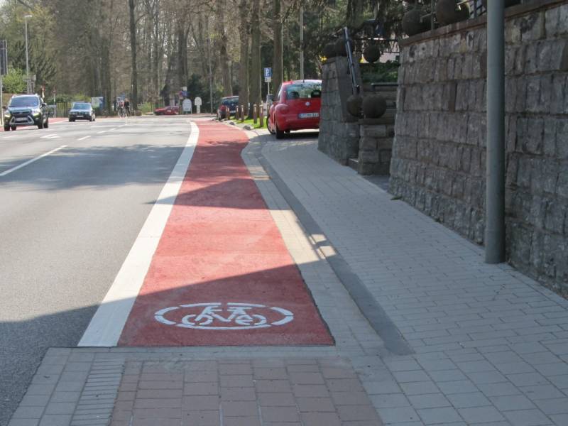 Die Seitenstreifen sind allenfalls eine Alternative für Radfahrende, die im Verlauf vor- und nachher die Radwege benutzen wollen. Die Markierungen und Einfärbungen, die den Eindruck einer Radverkehrsanlage vermitteln, müssen entfernt werden.