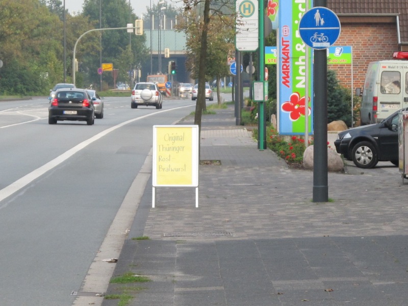 Entgegen der Fahrtrichtung ist der Radweg bis zur Bruder-Konrad-Straße mit Zeichen 240 (kombinierter Geh- und Radweg) gekennzeichnet. Hier sollte geprüft werden, ob stattdessen auf die Beschilderung 239 mit Zusatzzeichen 1022-10 (Gehweg, Radfahrer frei) umgestellt werden kann. Auf der Gegenseite befindet sich in Fahrtrichtung ebenfalls eine benutzungspflichtige Radverkehrsanlage, auf die in Höhe der Einfahrt zur Feuerwehr über die vorhandene Ampelanlage gewechselt werden könnte. Allerdings wäre hierzu die sich ebenfalls in sehr schlechtem Zustand befindliche Radverkehrsanlage ebenfalls grundlegend zu verbessern.