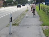 Der Radverkehr kann hier in Form eines Radfahrstreifens über den sich baulich in deutlich besserem Zustand befindlichen Mehrzweckstreifen geführt werden. Erfahrungsgemäß wird der Mehrzweckstreifen derzeit nur sehr sporadisch von parkenden Kraftfahrzeugen benutzt. An zwei Stellen, nämlich in Höhe der Shell-Tankstelle und des Autohaus Lenz, befinden sich Leitpfosten auf dem Mehrzweckstreifen, die entfernt werden müssen, da Oberflächenschäden gerade in diesem Bereich von Radfahrern umfahren werden. Hierdurch besteht erhebliche Kollisionsgefahr mit den eng zusammenstehenden Leitpfosten.