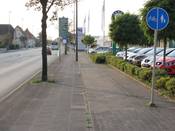In Höhe eines Autohauses (Bilder 1 und 2) sowie wenige hundert Meter weiter in Höhe einer Postfiliale (Bilder 4 - 6) wird der gemeinsame Rad- und Gehweg über einen Bürgersteig geführt. Insbesondere in Höhe der Postfiliale kommt es regelmäßig zu Konfliktsituationen mit Fußgängern. Durch einen Briefkasten und Bäume ist der Weg zusätzlich eingeengt.