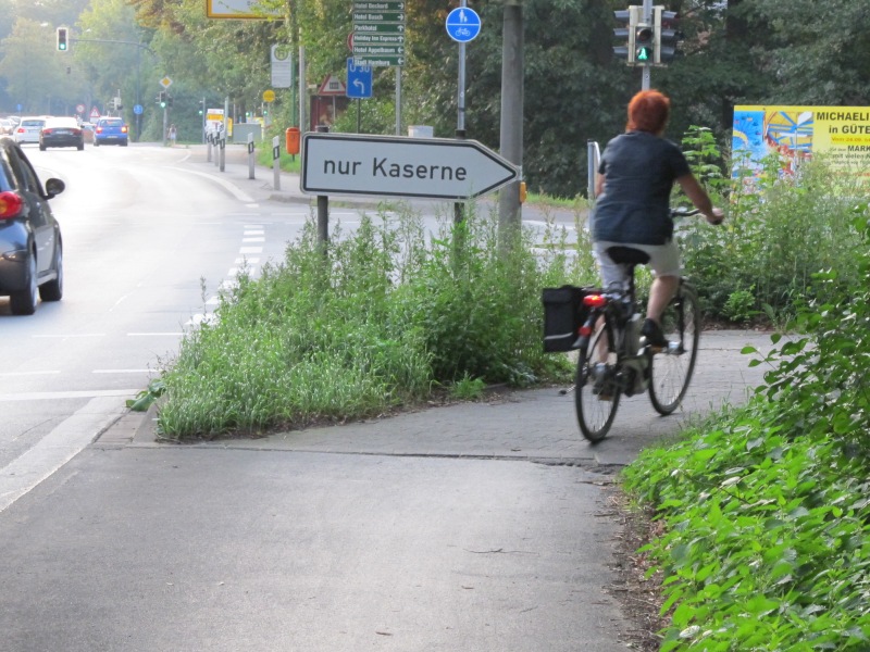 In Höhe der Einfahrt der Kaserne wird der Radverkehr durch eine starke Verschwenkung über die dortige Radfurt geführt (Bild 10).