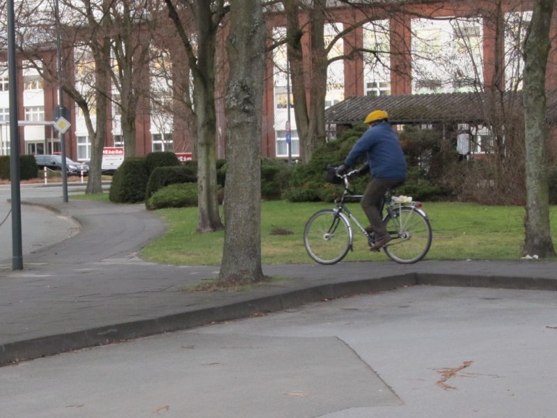 Die Westheermannstraße ist eine viel befahrene Radverkehrsverbindung ab dem östlichen "Mädchenviertel" über die Carl-Miele-Straße, Pfälzer Straße und Langer Weg in den Richtungen Innenstadt und nördlicher Stadtrand. Radfahrer befahren hier immer notgedrungen auch entgegen der Fahrtrichtung verbotswidrig die nicht für den Radverkehr freigegebenen Gehwege der Westheermannstraße und der Annenstraße. Während unserer Ortsbesichtigung fuhren innerhalb von drei Minuten vier Radfahrer auf den ca. 1,5 m schmalen Gehwegen (Bilder 7 - 10).