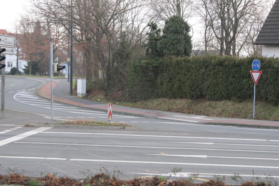 Das linksseitig aufgestellte Zeichen 241 (Bild 2) und die mittels Zeichen 240 StVO angeordnete Benutzungspflicht des gemeinsamen Fuß- und Radweges auf der anderen Straßenseite hindert Radfahrer daran, sich an der Kreuzung entsprechend einzuordnen, um z.B. auf der für den Radverkehr freigegebenen Fahrbahn der Hans-Böckler-Straße weiterzufahren (Bild 9).