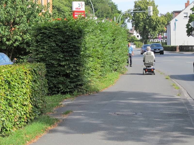 Der Geh-/ Radweg ist in Fahrtrichtung rechts für Radfahrer benutzungspflichtig. In Gegenrichtung ist er mittels Verkehrszeichen 239 iVm Zusatzzeichen 1022-10 (Gehweg - Radfahrer frei) für den Radverkehr freigegeben Siehe auch die Mangelmeldung "Rheda-Wiedenbrück, Gütersloher Straße I". Durch die hohe Hecke werden entgegenkommende Verkehrsteilnehmer zu spät gesehen. Zudem schränkt die Hecke die Breite des Geh-/ Radweges ein.