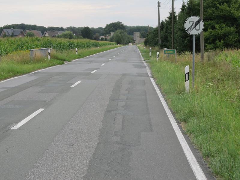 Im Verlauf vorher sind keine straßenbegleitenden Sonderwege vorhanden. Da hier für Radfahrende und andere Verkehrsteilnehmer keine erheblich erhöhte Gefahrenlage besteht, hat die Straßenverkehrsbehörde keine Beschränkungen oder Verbote des fließenden Verkehrs angeordnet (Bild 2).
