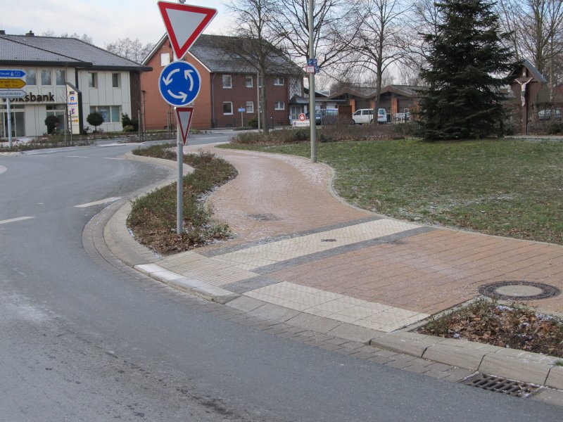 Da an den Knotenpunktarmen in den Richtungen Gütersloh und Schloß Holte (Bild 10) keine Radverkehrsanlagen vorhanden sind, sollten Radfahrer in diesem Kreisverkehr auf der Fahrbahn fahren. Die Verkährsstärke ist hier zeitweise sehr hoch. Daher sollten Übergänge von den Rad- Gehwegen auf Fahrbahnniveau angelegt werden. In dem Handbuch Fußgänger- und radfahrerfreundliche Gestaltung von kleinen Kreisverkehrsplätzen im Innerortsbereich heißt es auf Seite 14: "Dazu sind die Radwege in der Zufahrt komfortabel und baulich geschützt auf die Fahrbahn zu führen, um die Nutzung der Gehwege durch Radfahrer zu minimieren." Diese Radverkehrsführung hat sich bei Gütersloher Kreisverkehren bewährt. Das folgende Bild zeigt eine gut gelöste Kreisverkehrszufahrt an der Neuenkirchener Straße in Gütersloh.