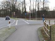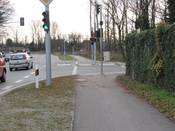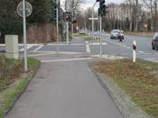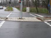 An der ca. 200 m entfernten und nicht mit einer LSA ausgestatteten Kreuzung Bielefelder Straße / Hauptstraße wurde der Übergang optimal gestaltet (Bild 3). Die Radfahrerfurt wird getrennt von der Fußgängerfurt ohne Höhenunterschied über die Fahrbahn geführt. Diese Lösung wäre ohne Mehraufwand auch an der LSA- geregelten Kreuzung möglich gewesen. Das wäre auch hinsichtlich der Signalisierung vorteilhafter gewesen. Laut den Richtlinien für Lichtsignalanlagen (RiLSA) und den Empfehlungen für Radverkehrsanlagen (ERA) der Forschungsgesellschaft für Straßen- und Verkehrswesen kann eine Radfahrfurt, die nicht direkt an eine Fußgängerfurt angrenzt, zusammen mit dem Kraftfahrzeugverkehr signalisiert werden, ggf. mit eigenen Signalgebern.