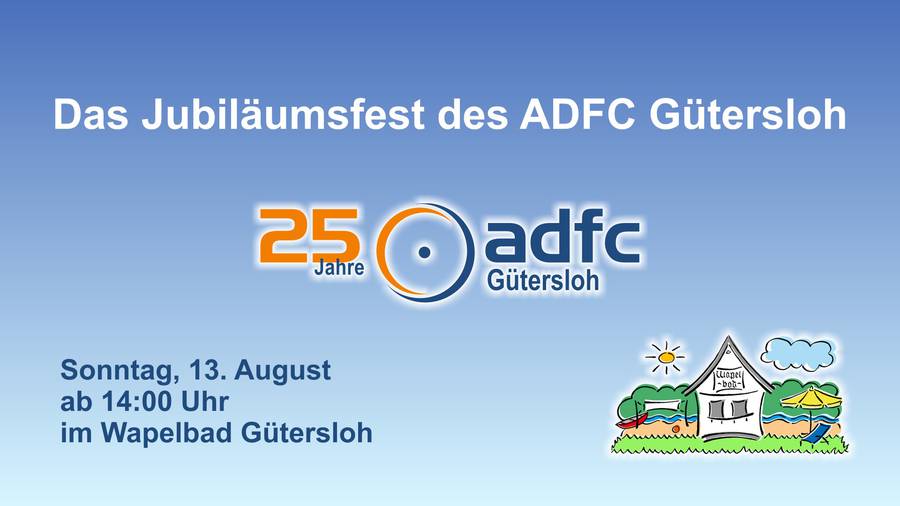 Der ADFC Gütersloh wird im August 25 Jahre alt! Dies wollen wir am Sonntag, 13.8.2017 im Gütersloh Wapelbad mit unseren Mitgliedern und anderen Fahrradbegeisterten aus dem Kreis Gütersloh feiern!