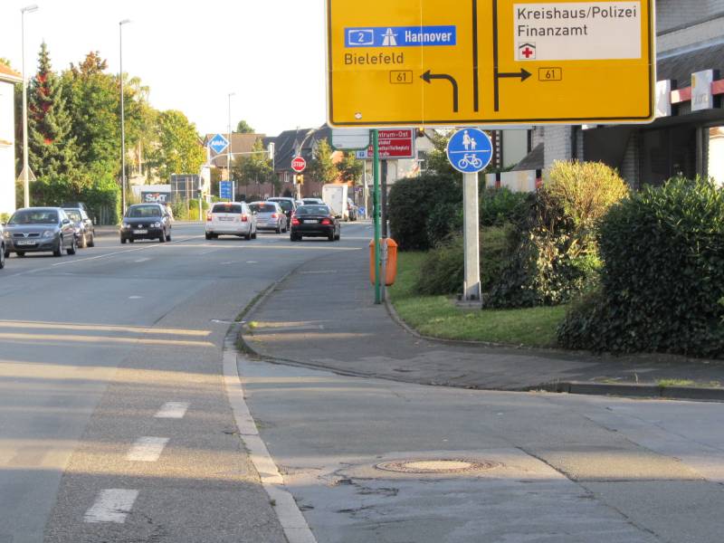 „Durch die Anordnung der Radwegebenutzungspflicht auf diesem kurzen Stück werden Radfahrer rechts neben LKWs gezwungen. Dort befinden sich Radfahrer im toten Winkel und werden beim Rechtsabbiegen übersehen“, so Daniel Neuhaus vom Allgemeinen Deutschen Fahrrad-Club (ADFC) aus Gütersloh.