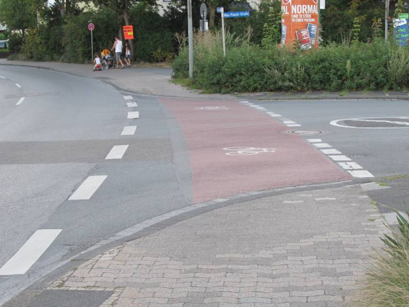 An den untergeordneten Straßen Franz-Grochtmann-Straße, Einsteinweg und Max-Planck-Straße sind die Zeichen 205 (Vorfahrt gewähren) und 206 (Halt. Vorfahrt gewähren) noch mit Zusatzzeichen 1000-32 (Radfahrer kreuzen von rechts und links) versehen. Die Zusatzzeichen müssen entfernt werden.