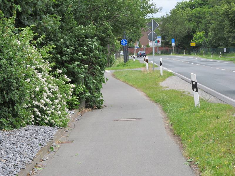 Bild 1 vom Juli 2012: Der in beiden Fahrtrichtungen befahrbare Geh- und Radweg ist durch Pflanzenbewuchs stark eingeengt