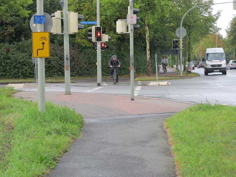 Im September 2013 wurde vor der Kreuzung mit dem Stadtring Kattenstroth ein Vorwegweiser aufgestellt (Bild 3), der den Radverkehr in Fahrtrichtung stadteinwärts darauf hinweist, dass auf die rechte Straßenseite gewechselt werden soll. Da hier das Ende des linken Radweges nicht zweifelsfrei erkennbar ist, sollte gemäß der Verwaltungsvorschrift zur Straßenverkehrs-Ordnung (VwV-StVO, zu den Zeichen 237, 240 und 241 / III.) hinter der Kreuzung zusätzlich ein Zeichen 240 mit dem Zusatzzeichen "Ende" angeordnet werden.