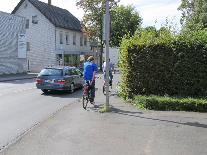 14.08.2016: Die linksseitige Freigabe wurde ab der Einmündung Am Werl mittels Verkehrszeichen 239 (Gehweg) aufgehoben. Da der Gehweg im Verlauf vorher weiterhin linksseitig freigegeben und im weiteren Verlauf linksseitig benutzungspflichtig ist, benutzen viele Radfahrer weiterhin den linken Gehweg durchgehend (Bild 7).