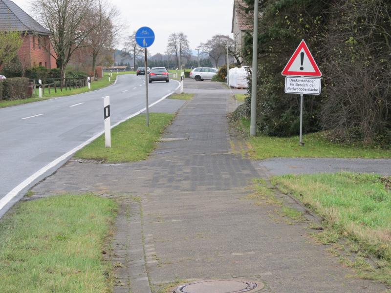 An dem Geh-/Radweg wurden Verkehrszeichen 101 (Gefahrenstelle) angebracht (Bilder 7 - 9). Auf den Zusatzzeichen wird die Gefahr näher bezeichnet: "Deckenschäden im Bereich der Radwegoberfläche". Die Neue Westfälische berichtete am 05.11.2013: