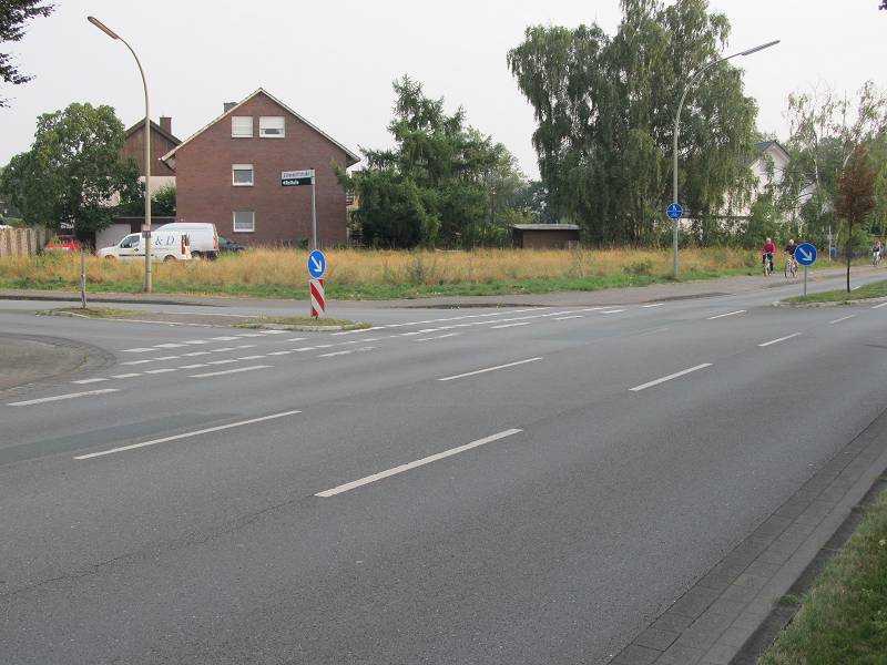 Im Verlauf vorher ist der linke gemeinsame Geh-/Radweg nicht für den Radverkehr freigegeben. In Fahrtrichtung Stadauswärts müssen Rad fahrende 170 m vor dem Kreisverkehr auf die linke Straßenseite wechseln (Bild 2). An dem rechten getrennten Geh-/Radweg ist kein Verkehrszeichen 240 / 241 angeordnet. Ab der Einmündung der Eichendorffstraße ist Radfahren auch auf dem rechten Geh-/Radweg unzulässig (Bild 3).