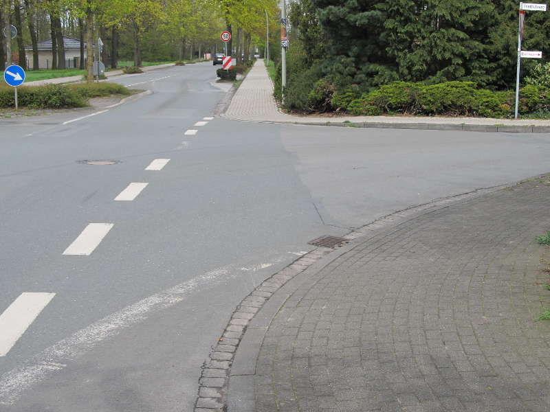 Bild 12, April 2016: An der Einmündung Friedhofsweg fehlt die Radwegefurt.